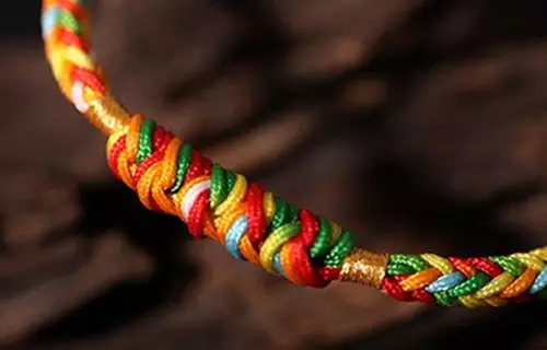 簡單的以五色絲線合股成繩,系于臂膀;在五彩繩上綴飾金錫飾物,掛于項頸;五彩繩折成方勝,飾于胸前;五彩繩結(jié)為人像戴之;以五彩絲線繡繪日月星辰烏獸等物,敬獻(xiàn)尊長。此俗始于漢代。